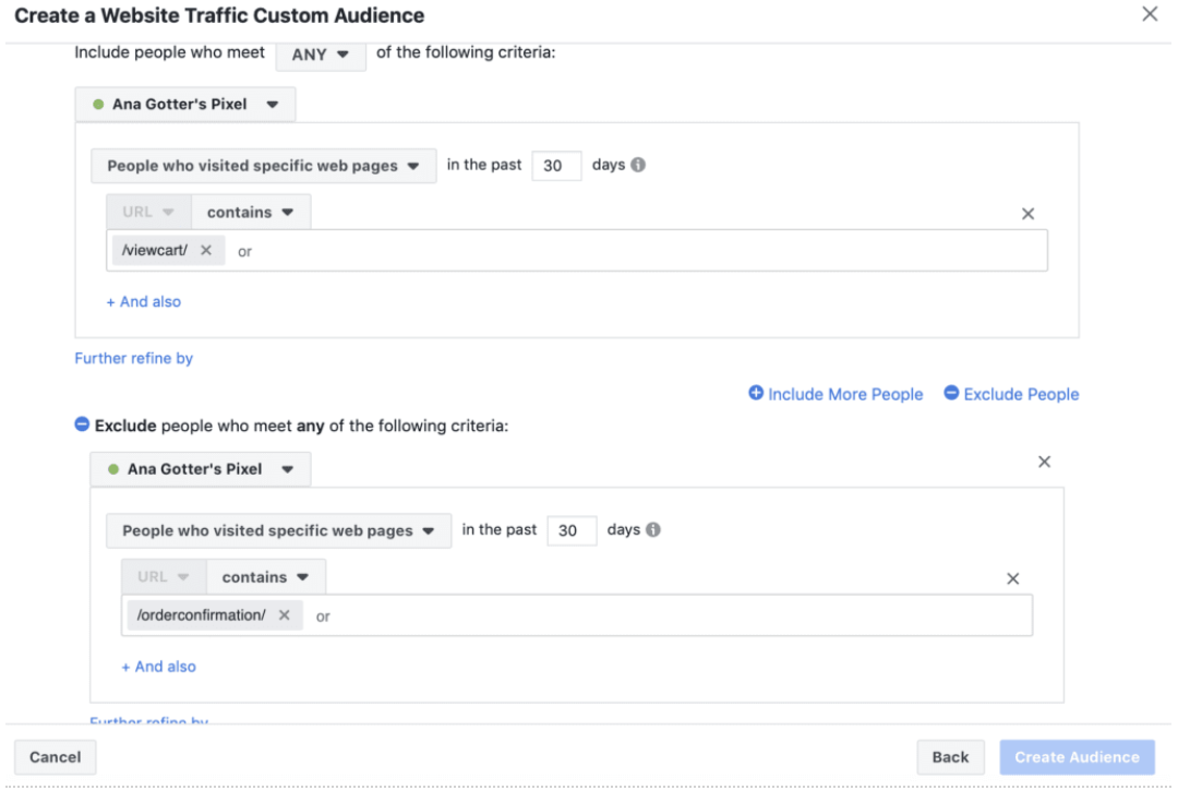 Az egyik legjobb példa erre a kosárelhagyás. A dinamikus hirdetéseknek köszönhetően megjelenítheted hirdetésben azt a terméket, amit a felhasználó a kosárban hagyott, de nem vásárolt meg. Egyszerűen csak a célzásnál add meg azt az oldalt (URL részlet, ahogy az ábra mutatja), amit megnéztek és zárd ki azt, ami már a következő lépés lenne. Hogy érthetőbb legyen: ahogy a képen látszik kosár elhagyókra szeretnénk célozni, ezért kizárjuk azokat, akik már vásároltak.