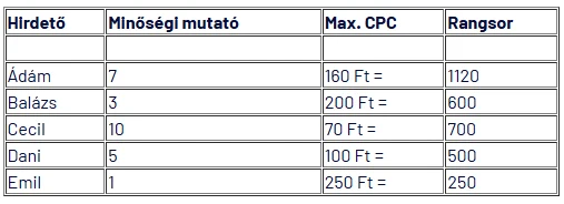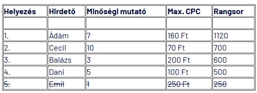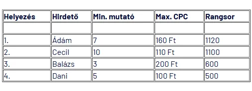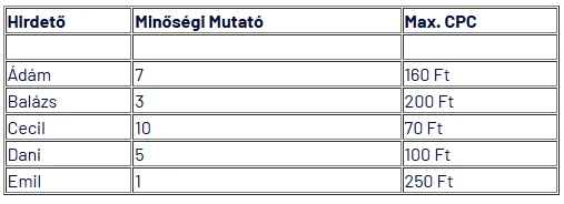 Vegyük észre, hogy habár Ádám maximális kattintásonkénti költsége 160 Ft volt, mégis csak 100 Ft-ot fizet egy kattintásért és az első helyen van, köszönhetően viszonylag magas minőségi muatójának. Ugyanez igaz Ceilre, akinek max CPC-je 70 Ft, mégis csak 60 Ft-ot fizetne egy kattintásért.
