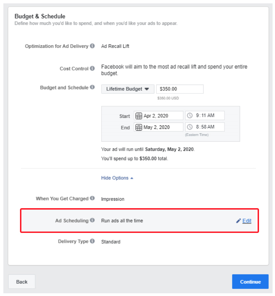 Mielőtt tovább mennénk, szeretném megjegyezni, hogy a hirdetésütemezés nem egyenlő az időzítéssel. Utóbbit mindig be kell állítanod függetlenül attól, hogy napi szintű költségkeretet adtál-e meg vagy élettartamot. Az ütemezés ezzel ellentétben csak akkor érhető el, ha a hirdetésedet élettartamra állítottad be. Az ütemezés egyébként egy rendkívül hasznos funkció, mert ezzel le tudod korlátozni, hogy melyik napokon vagy napszakokban jelenjen meg a hirdetésed. Gyakorlatilag ugyanúgy működik, mint Google Adsben. Így sokkal hatékonyabban érheted el a célközönségedet is, ha tudod azt, hogy mikor vannak leginkább online. A fentiek mintegy bevezetésként szolgáltak, azonban a továbbiakban térjünk is rá, hogy miként is érdemes elvégezned ezt a beállítást.