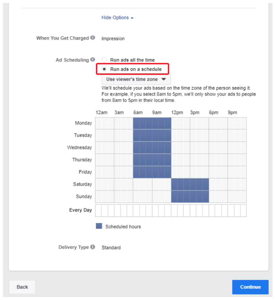 4. lépés: Válaszd a „hirdetések futtatása ütemezés alapján” opciót. Alább láthatsz egy táblázatot, ahol napok és napszakok szerint tudod meghatározni, hogy mikor szeretnéd futtatni a hirdetésed. Szerencsére elég jól összerakták ezt a táblát, mivel 1 órás pontossággal tudod beállítani az ütemezést. Ha például úgy tudod, hogy a közönséged délután 3 és 5 óra között a legaktívabb, akkor egyszerűen csak arra az intervallumra állítod be az ütemezést. Ez teljese rajtad áll, sőt előfordulhat, hogy hétvégén más sávban vagy egyáltalán nem kell futtatnod a hirdetéseid.