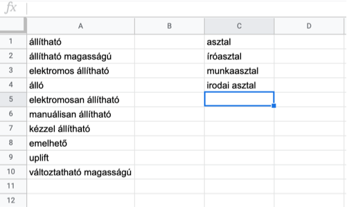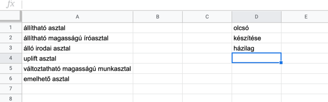 Ezen harmadik oszlop szavait pedig a generátor eszköz harmadik oszlopába másolva, nagyon releváns long-tail kulcsszavakat fogunk kapni. Pl.: „Állítható asztal rendelés”. Aki erre keres, az biztosan mi a célcsoportunk és már a vásárlási döntés fázisában van.