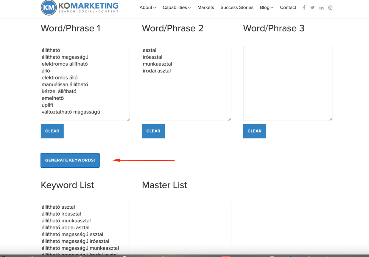 Az lesz most a feladatunk, hogy minden melléknévhez hozzátársítjuk az összes főnevet. Ehhez egy eszközt fogunk segítségül hívni. Itt találod: https://komarketing.com/resources/keyword-generator/